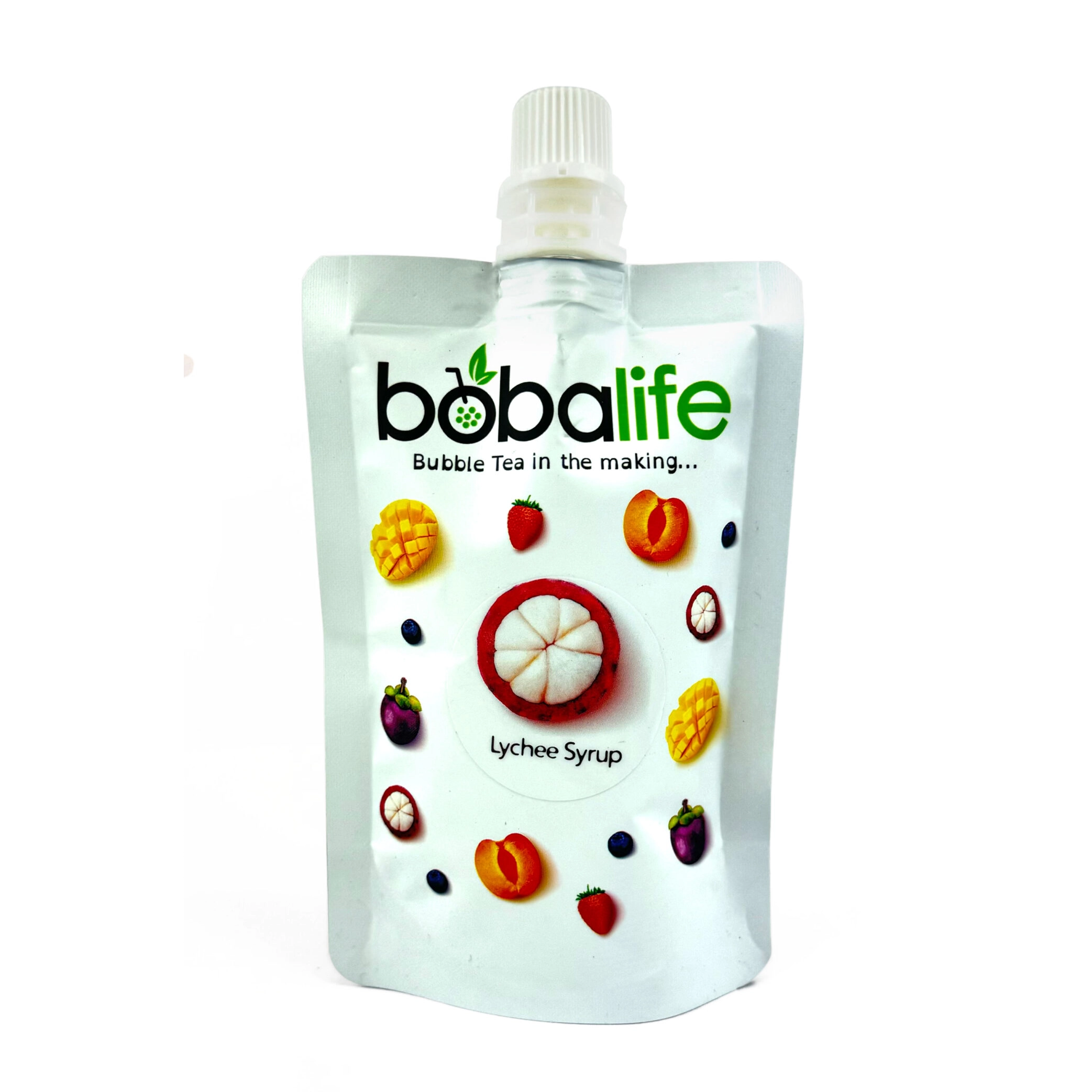 Boba Life premium Taiwanese lychee flavoured bubble tea syrup by Boba Life in small 150g packet. Use this lychee syrup mix to create a fruit bubble tea and add bursting bubbles or traditional chewy boba balls. Just mix the syrup with your choice of cold tea, add the boba, ice and serve with a jumbo straw. Can also be used to add colour and flavour to bubble tea milk drinks.