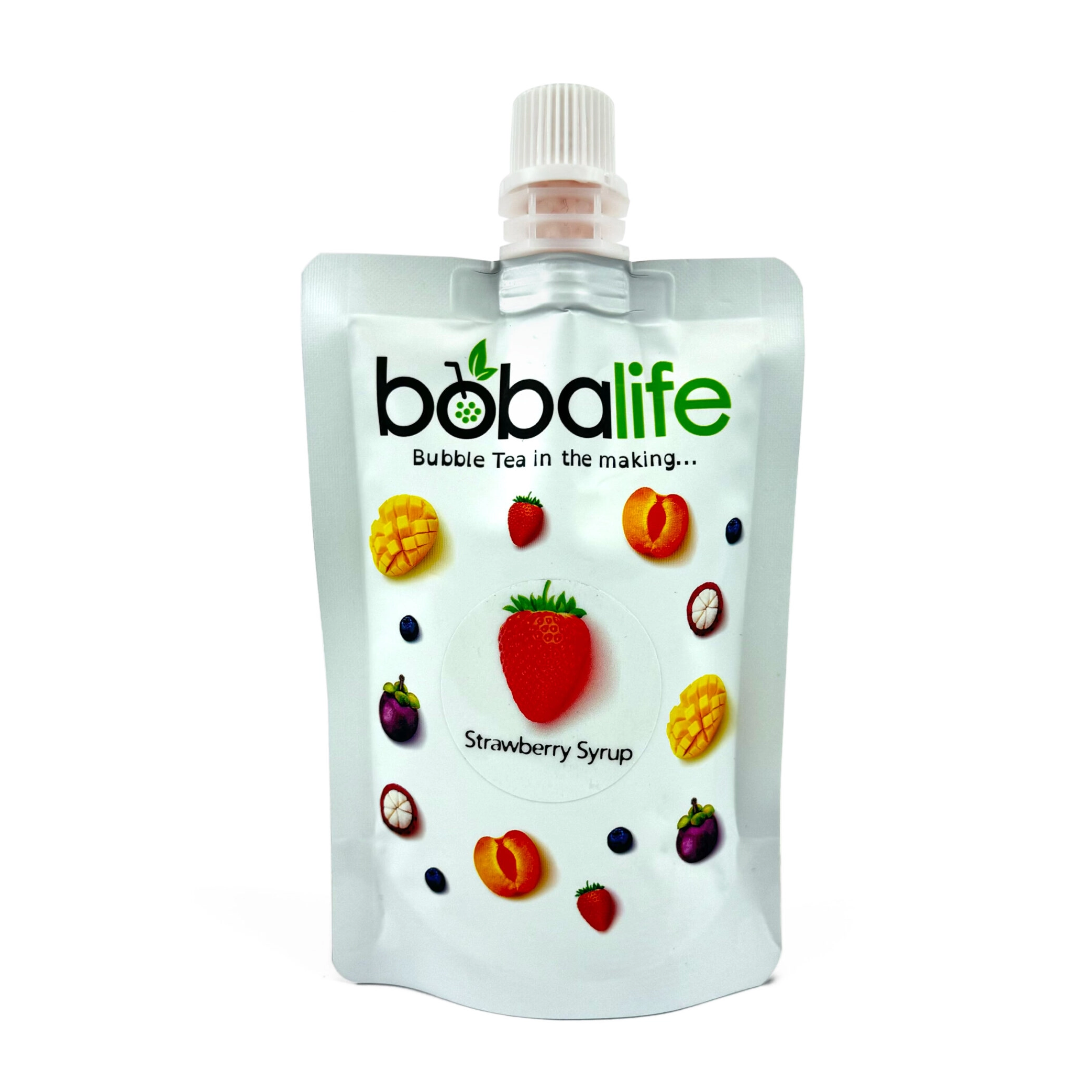 Boba Life premium Taiwanese strawberry flavoured bubble tea syrup by Boba Life in small 150g packet. Use this strawberry syrup mix to create a fruit bubble tea and add bursting bubbles or traditional chewy boba balls. Just mix the syrup with your choice of cold tea, add the boba, ice and serve with a jumbo straw. Can also be used to add colour and flavour to bubble tea milk drinks.