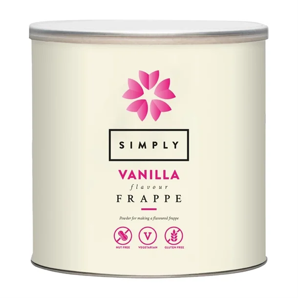 Simply Vanilla Frappe Mix in a 1.75kg tin. A perfectly sensational and smooth vanilla frappe powder which delivers delicious drinks for your menu. To make the perfect 12oz frappe, fill a cup with ice cubes and pour in 6oz (180ml) of cold milk (or fill half the cup). Transfer the contents of the cup to a blender with one scoop of this frappe mix. Blend until smooth and serve.